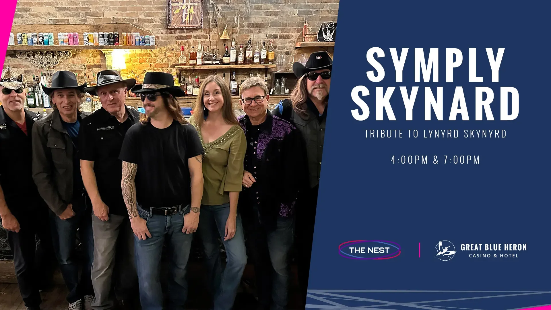Join us as Symply Skynyrd captures the spirit and energy of Lynyrd Skynyrd’s iconic live performances.. Two Showings 4pm and 7pm. The Nest Entertainment Centre at Great Blue Heron Casino.