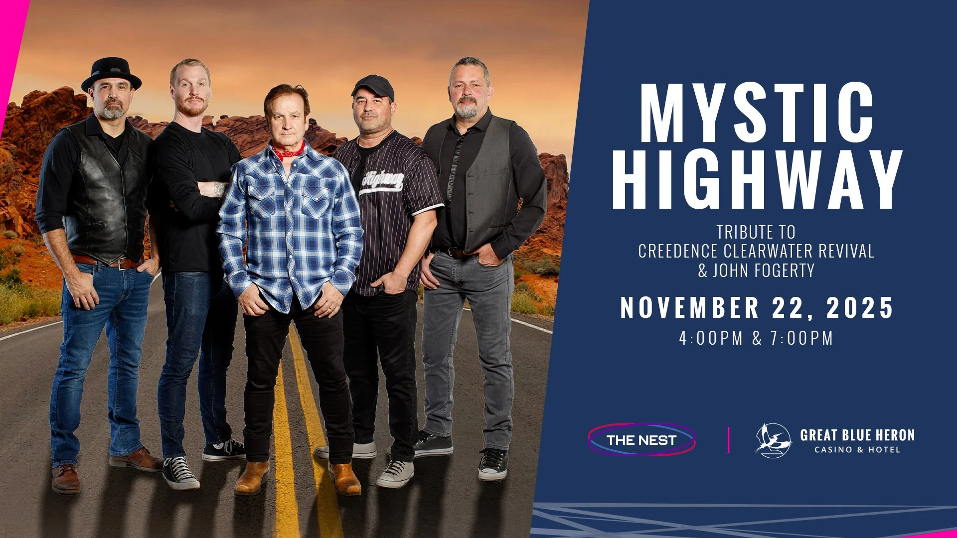 Relive the legendary sounds of CCR and John Fogerty with Mystic Highway’s captivating tribute. Two Shows: 4pm and 7pm. The Nest Entertainment Centre at Great Blue Heron Casino.